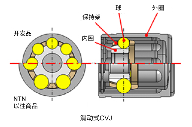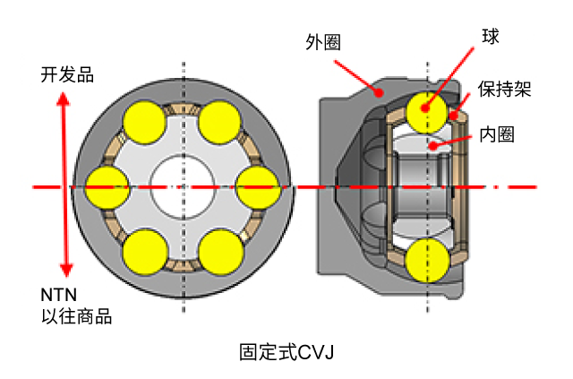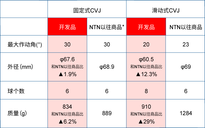 NTN对于分别安装在轮胎侧的固定式CVJ和分速器侧的滑动式CVJ进行了最大作动角的修改,并通过部件的优化设计等使部件薄壁化和小型化,确保在维持必要强度的同时,实现小型、轻量化。
